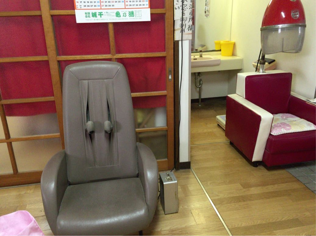 (上)おなじみの被り物(写真右)やマッサージチェアーなんかも備えてあります。
