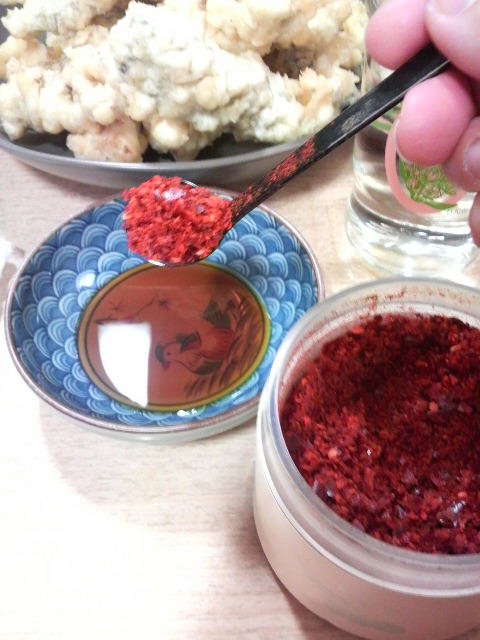粗挽きのコチュカル(粉唐辛子)をどっさり入れた